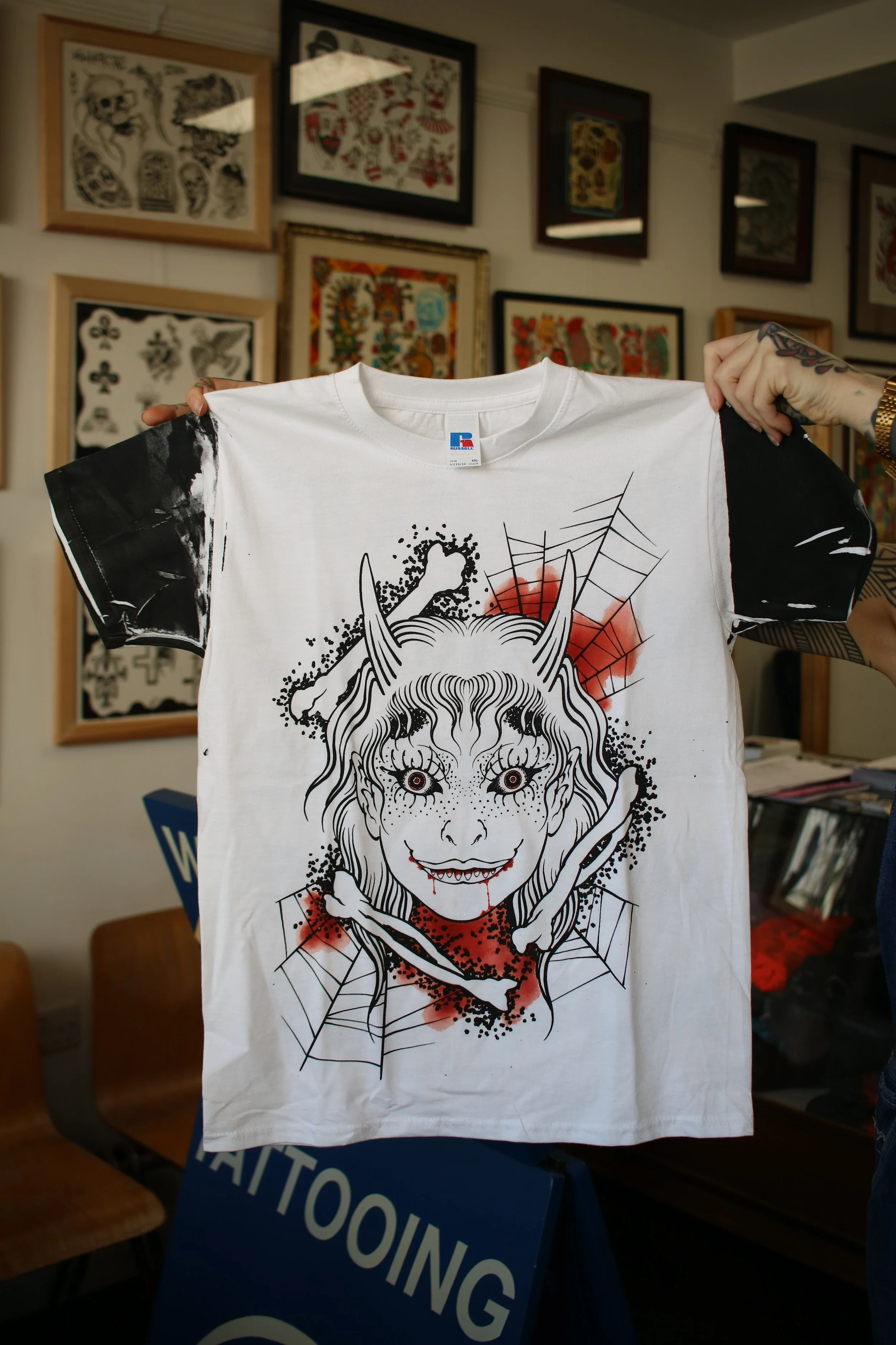 These shirts feature screen printed black sleeves and painted red blood. Each shirt is completely unique and will vary slightly. All having freckles and blemishes here and there. None of these are perfect but they are made with love and care.