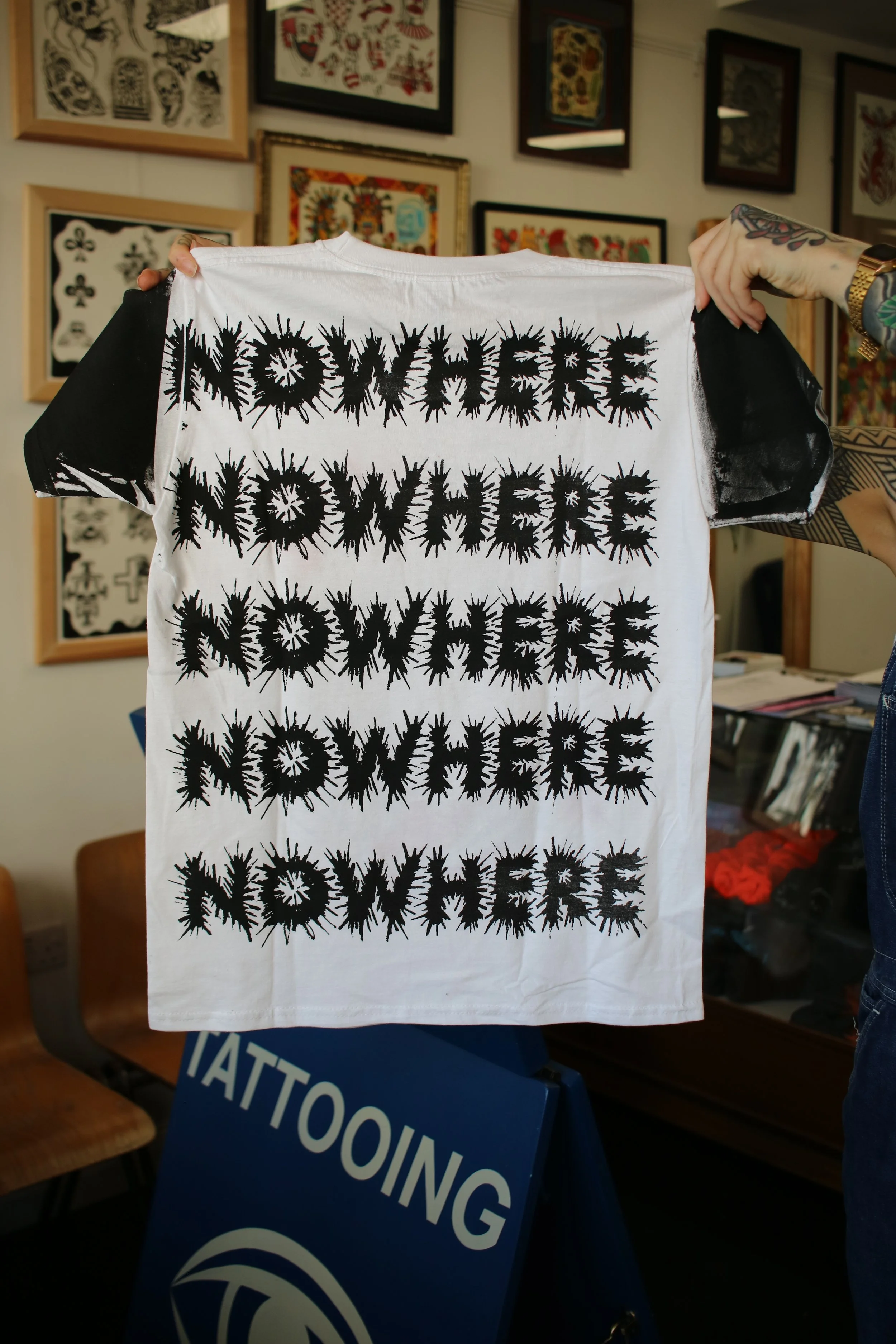 Hand screen printed by myself at home, front and back. Back print features “Nowhere” stacked, each word individually pulled for a full back print, no matter the size of shirt.