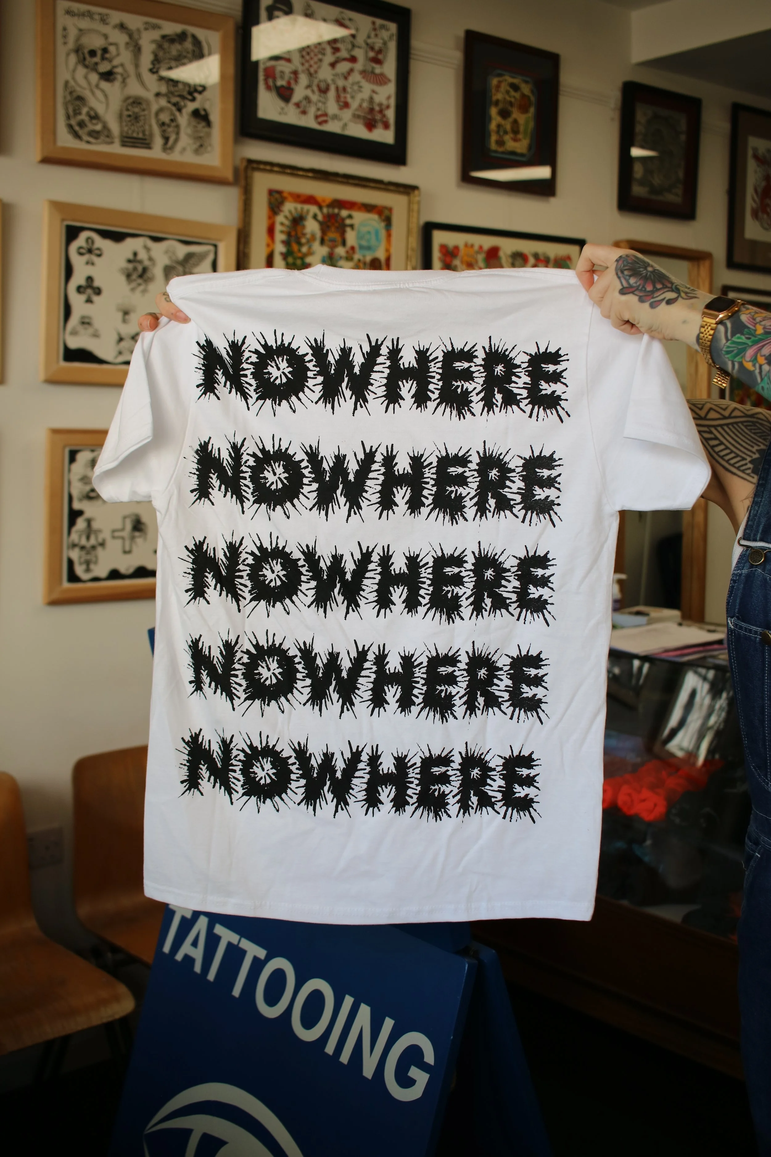 Hand screen printed by myself at home, front and back. Back print features “Nowhere” stacked, each word individually pulled for a full back print, no matter the size of shirt.